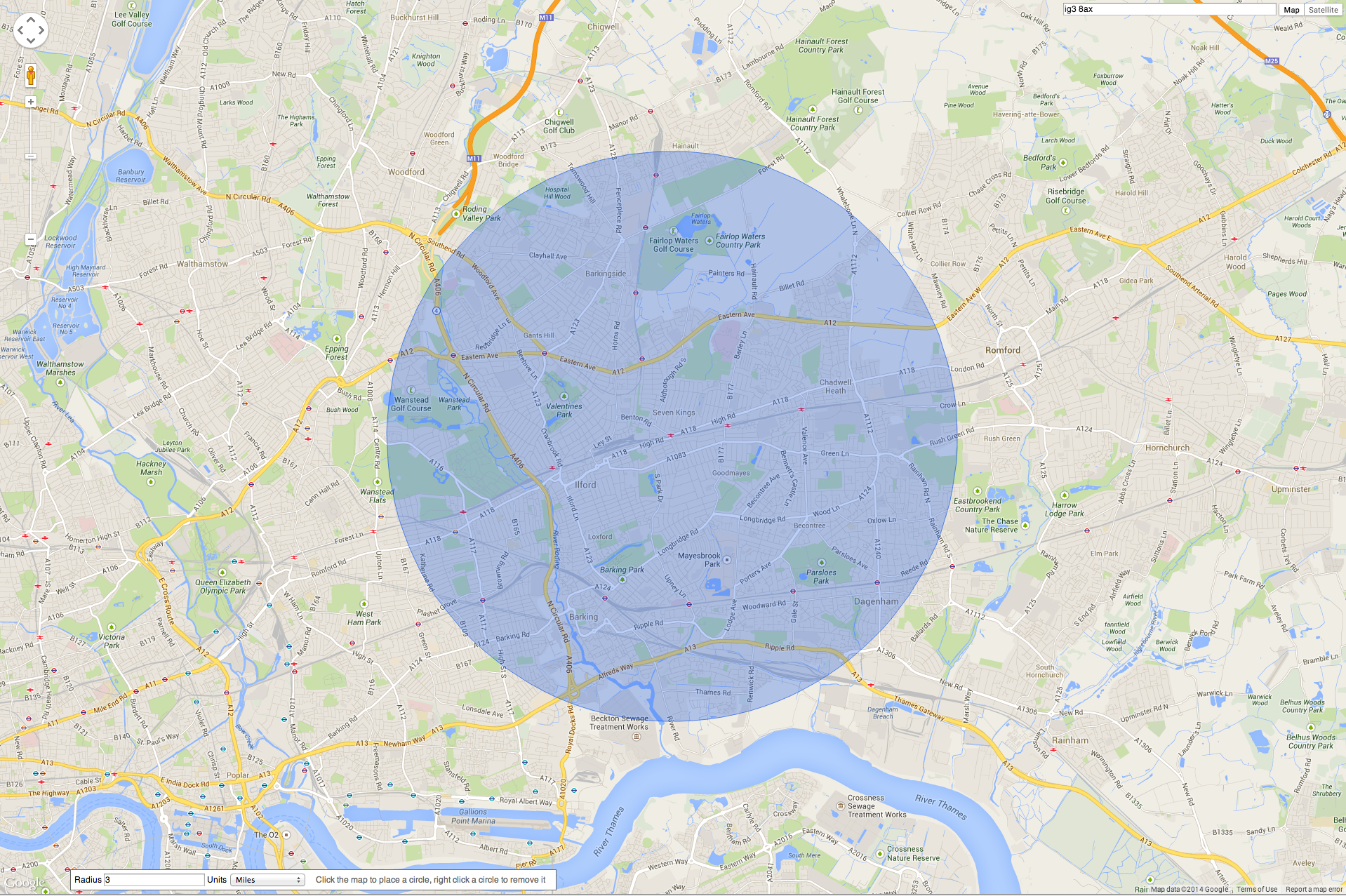 Map shows a circle of three mile radius. Bees will generally travel up to three miles to forage, which is anywhere in the circle, starting at the centre.